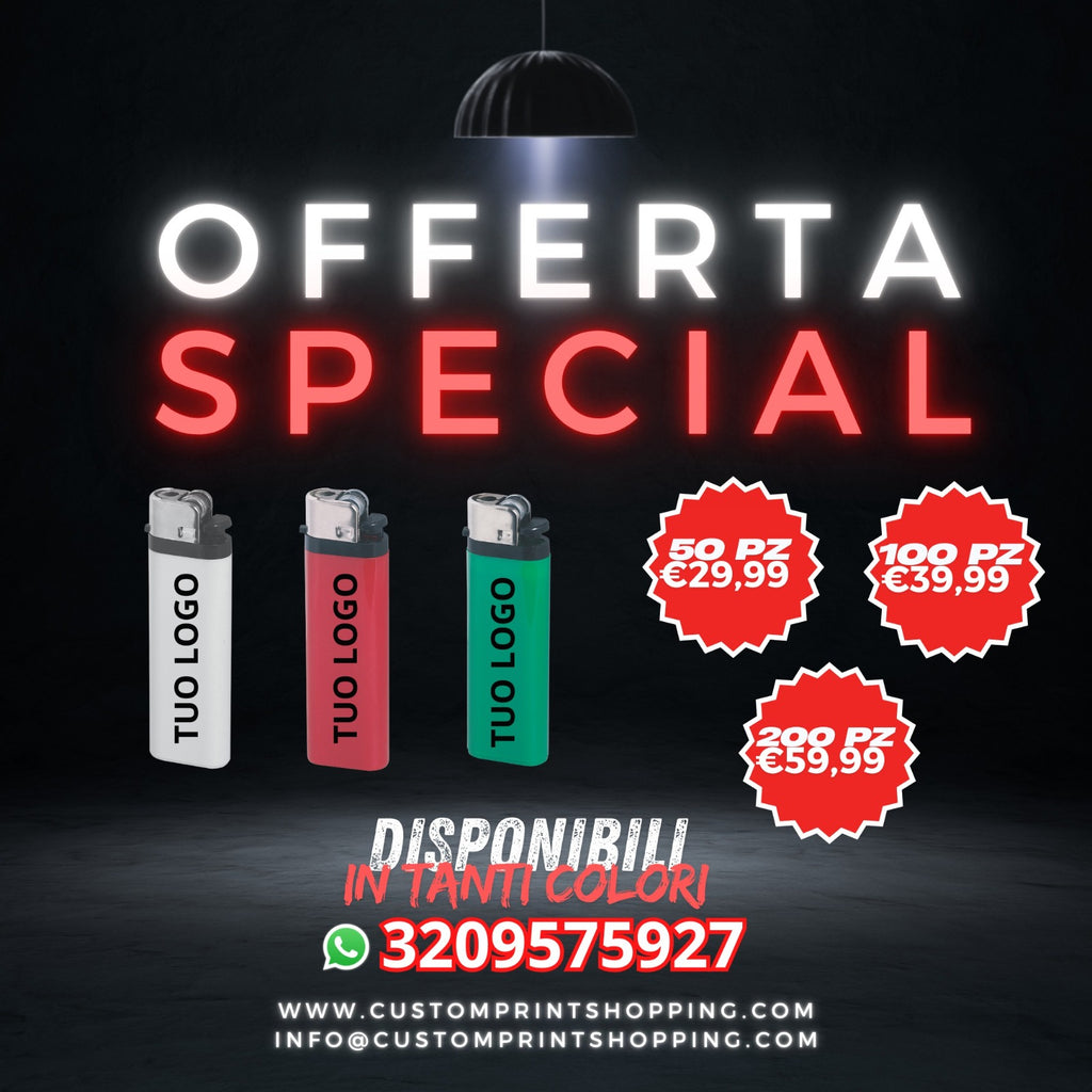 Accendino Personalizzato. Plastica. Vari Colori: Bianco, Blu, Giallo, Nero, Rosso, Verde Dimensioni: cm 2,4x9x0,9. Consegna ordine 10 giorni lavorativi dalla conferma della bozza. Bozza grafica gratis. Stampa su un lato. I prezzi sono da considerarsi iva inclusa. Questo prodotto può essere acquistato solo in multipli di 50 pz, per variante colore da inserire nelle note di personalizzazione.,( esempio 50 rosse, 50 blu, ecc.). Per ogni ordine effettuato verrà inviato tramite mail una simulazione pre-stampa da confermare. Hai bisogno di un quantitativo maggiore rispetto alla quantità disponibile?