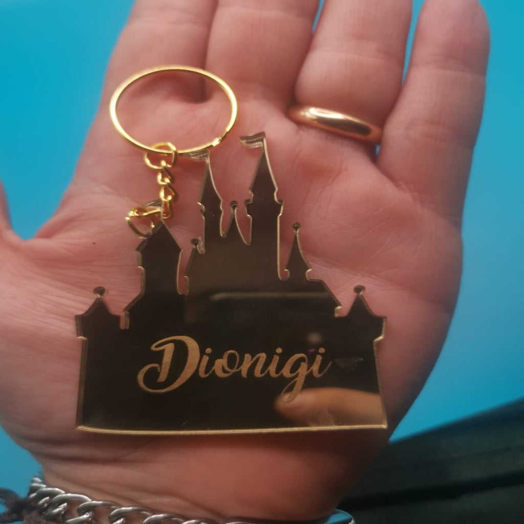 Portachiavi realizzato in plexiglass specchiato con il logo del Castello Disneyland Paris. Personalizzabile con il nome desiderato, è il gadget perfetto per qualsiasi evento magico. Porta sempre con te un pezzo di magia Disney con questo castello incantato. Completo di foro catenina e gancio.