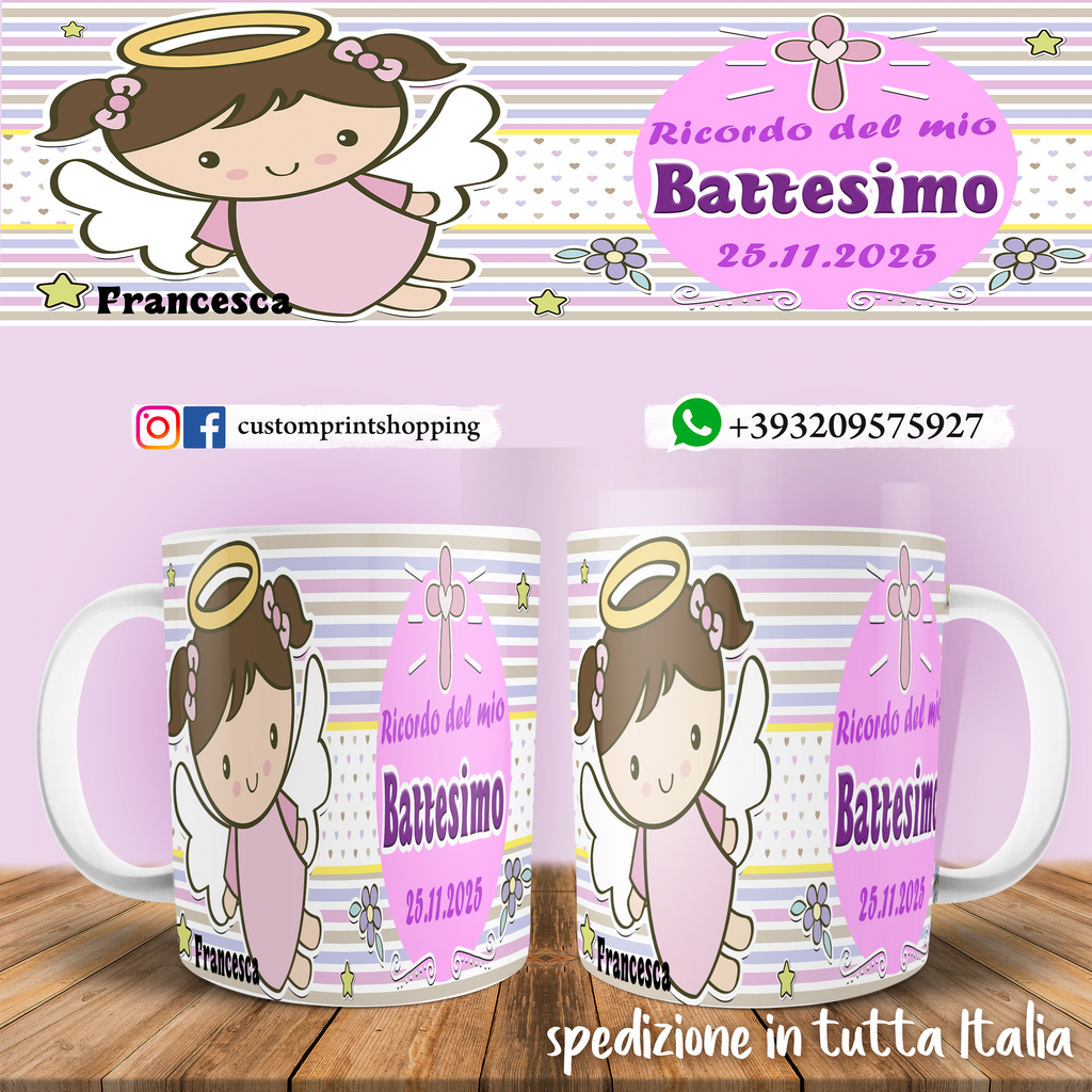 Celebra il battesimo del tuo bambino/a con la tazza personalizzata TAZZA BATTESIMO PERSONALIZZATA CON NOME E DATA MOD.1. Regalati un ricordo unico con questa tazza, perfetta per la tua festa di benvenuto. Decora la tua tazza con il nome e la data di nascita per un tocco speciale.
