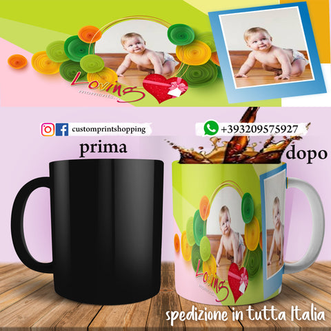 Descrizione: Tazza in ceramica realizzata in sublimazione, con stampa Full Over, resistente al microonde e ai lavaggi in lavastoviglie, con pratico manico che ne facilita la presa. Possibilità di personalizzazione. Capacità 325 ml .Molteplici usi: utilizzabile per bere caffè, latte, cappuccino, thè, oppure come fermacarte; può essere anche utilizzata per riporre penne e oggetti, oppure fantastica da collezionare o da tenere in esposizione. Perfetta per una Colazione speciale e per un Regalo originale.  .Stampata e confezionata in Italia . Possibilità di scelta tra bianca, magica, interno colorato.  WhatsApp: 3209575927
