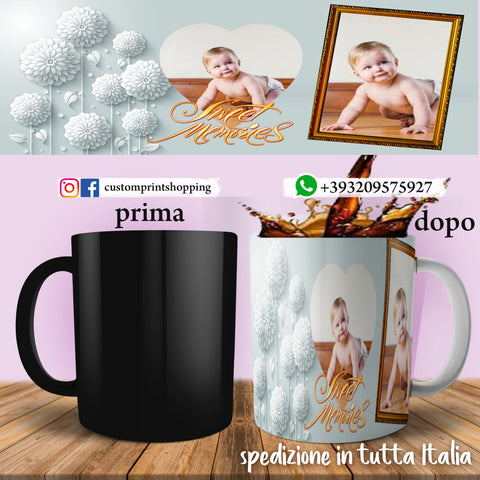 Descrizione: Tazza in ceramica realizzata in sublimazione, con stampa Full Over, resistente al microonde e ai lavaggi in lavastoviglie, con pratico manico che ne facilita la presa. Possibilità di personalizzazione. Capacità 325 ml .Molteplici usi: utilizzabile per bere caffè, latte, cappuccino, thè, oppure come fermacarte; può essere anche utilizzata per riporre penne e oggetti, oppure fantastica da collezionare o da tenere in esposizione. Perfetta per una Colazione speciale e per un Regalo originale.  .Stampata e confezionata in Italia . Possibilità di scelta tra bianca, magica, interno colorato.  WhatsApp: 3209575927